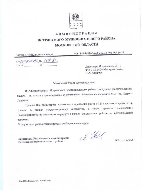 Пишу в этом разделе, если не прав перенесите плиз. Думаю информация будет интересна многим. Несколько недель назад обратился в электронную администрацию Московской области с обращением на плохую транспортную доступность. В пятницу пришло два письма. Одно официальный ответ от администрации Истринского района, другое как обращение к ответственным лицам. Побликую второе, надеюсь кому то это поможет. :)
