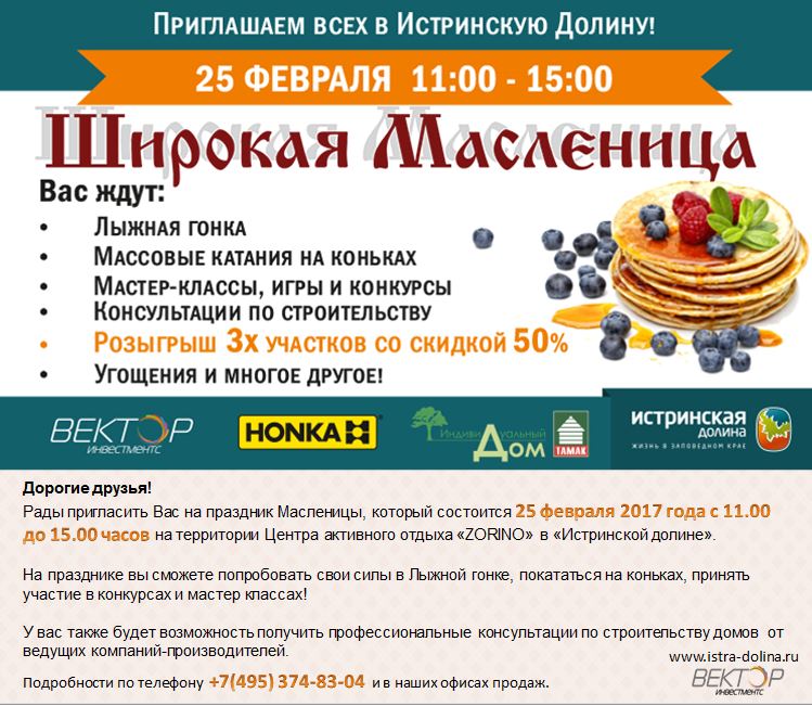 В программе: лыжная гонка, коньки, игры, конкурсы, угощения, розыгрыш 3-х участков со 50% скидкой, консультации по строительству домов и многое другое! Тел: +7(495)374-83-04.