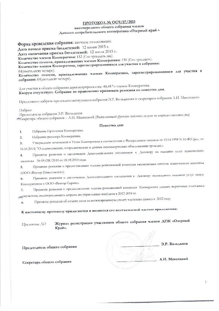 Пришло сообщение от Тимина Дмитрия с приложенным протоколом, результат "Кворум отсутствует".
