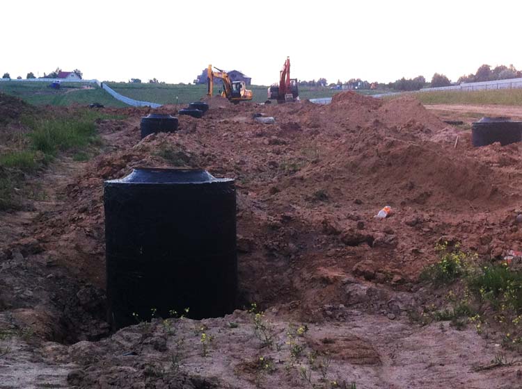 Были в заводи в прошлые выходные, ближе к вечеру. Рабочие уже дружно уезжали с поля на тракторе. По сравнению с прошлым разом добавилось врытых колодцев. Теперь они торчат почти по всему периметру поселка.