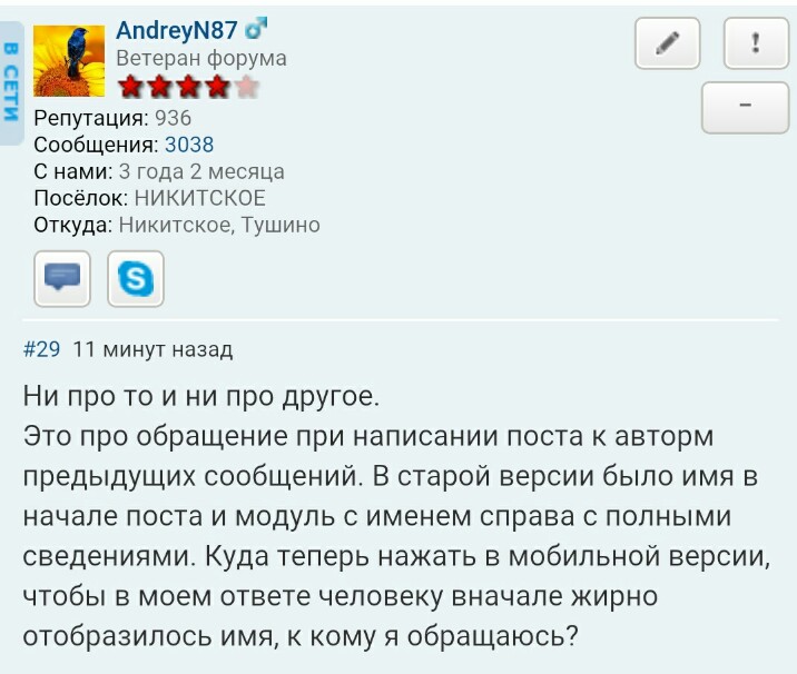Это про обращение при написании поста к авторм предыдущих сообщений. В старой версии было имя в начале поста и модуль с именем справа с полными сведениями. Куда теперь нажать в мобильной версии, чтобы в моем ответе человеку вначале жирно отобразилось имя, к кому я обращаюсь?