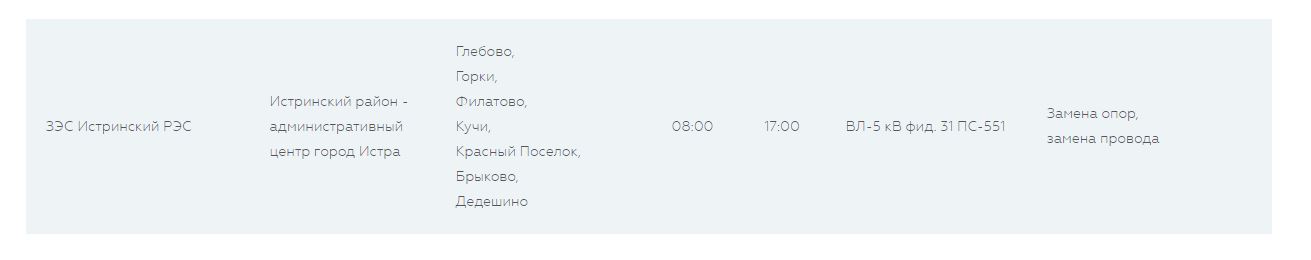 Позвонил в вектор сервис. Какой пупс ответил, что где-то авария на линии от монастыря. Истринский сети. Ничего сказать не может и с ними может связаться только некто Тимин или тимкин, какой то комендант. Потом сам мне перезвонил и сказал, что занимается этим энергогарант. И в лучшем случае устранят сегодня к ночи или завтра к обеду. Я не являюсь первичным источникником информации и говорю эТо не от первого лица. Поэтому хорошо бы перепроверить информацию из других источников. На меня прошу не ссылаться, я ответственность нести не могу за информацию и сроки устранения аварии. Звонил вот по этому телефону 8 909 911 80 73