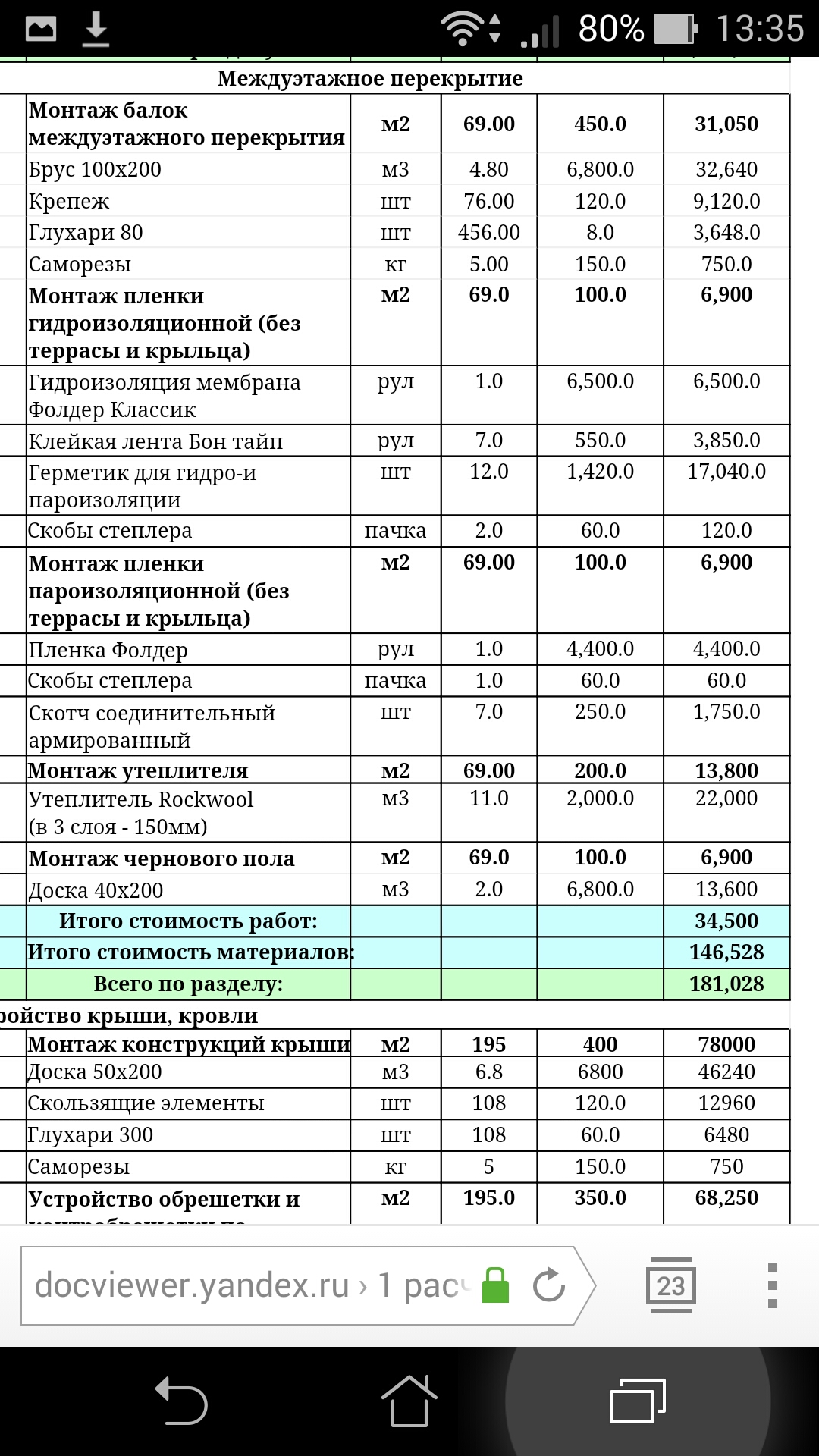 Из сметы получается, что 1 куб клеенки стоит 25.400 руб. Не слабо. Учитывая, что 190х170 не самый большой клееный брус, обычно побольше берут.