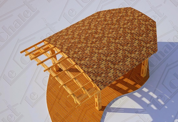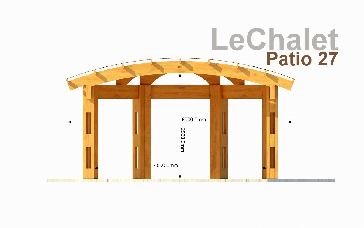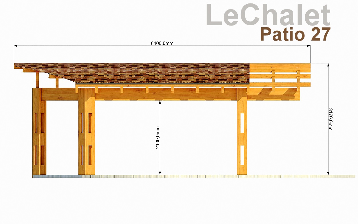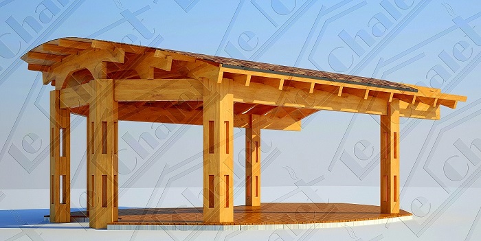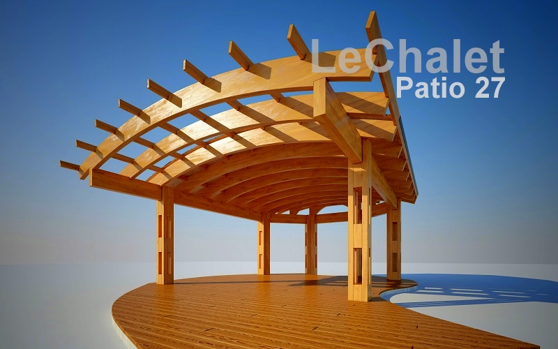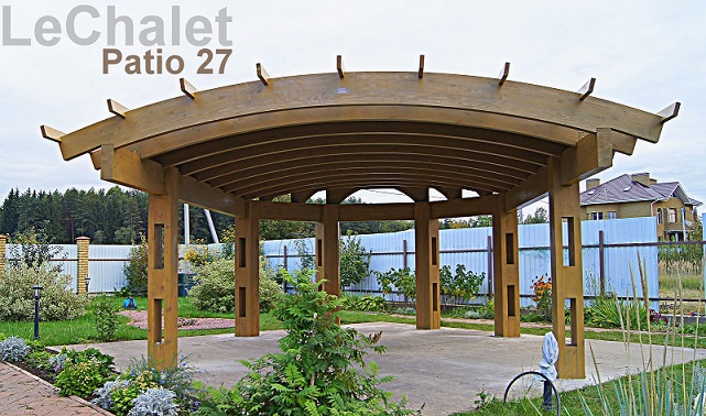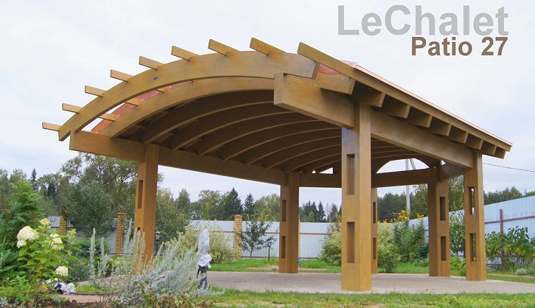 Изначально задача стояла в проектировании перголы, затем, отдавая дань нашему плачущему небу, решили все-таки накрыть кровлей, а для возможности ностальгировать по перголе, оставили открытыми пару полуарок. Такой получился навес - проект LeChalet Patio 27. В задней, узкой части навеса планируется размещение уличной печи с дымоходом и мангалом. Покрытие пола, его нетрадиционная форма в данном случае, соответствуют ландшафтному проекту заказчика и выполнены из лиственницы, потому, что она красива и стойко переносит плачущее небо, солнце и морозы. Форму и материал пола под навесом можем сделать по вашему заказу.