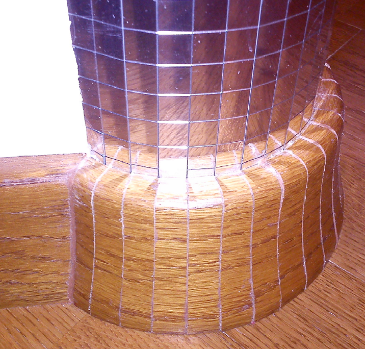 Плинтус вырезан секторами по одному сантиметру, прилегающему к квадратикам по 1 см. Вырезется не на коленке и не на табуретке, а торцовочной пилой, принцип одинаков.