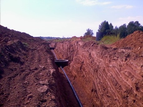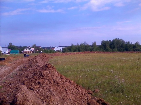 Как я понял, начали серъезно заниматься водопроводом. Вырыли экскаватором большую траншею для водопровода между большой и малой полянами. Везде стоят кольца под колодцы. Тянут трубы для воды.