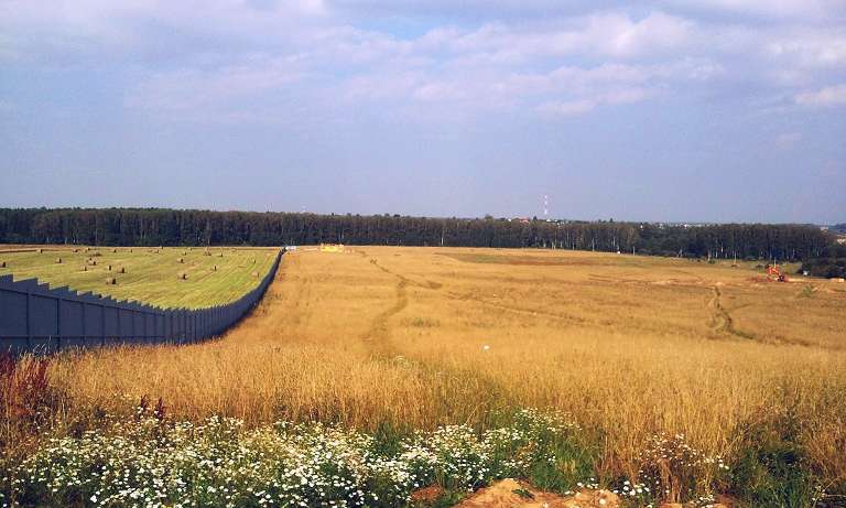 Работы идут, три экскаватора в поле, один возле забора, итого четыре.