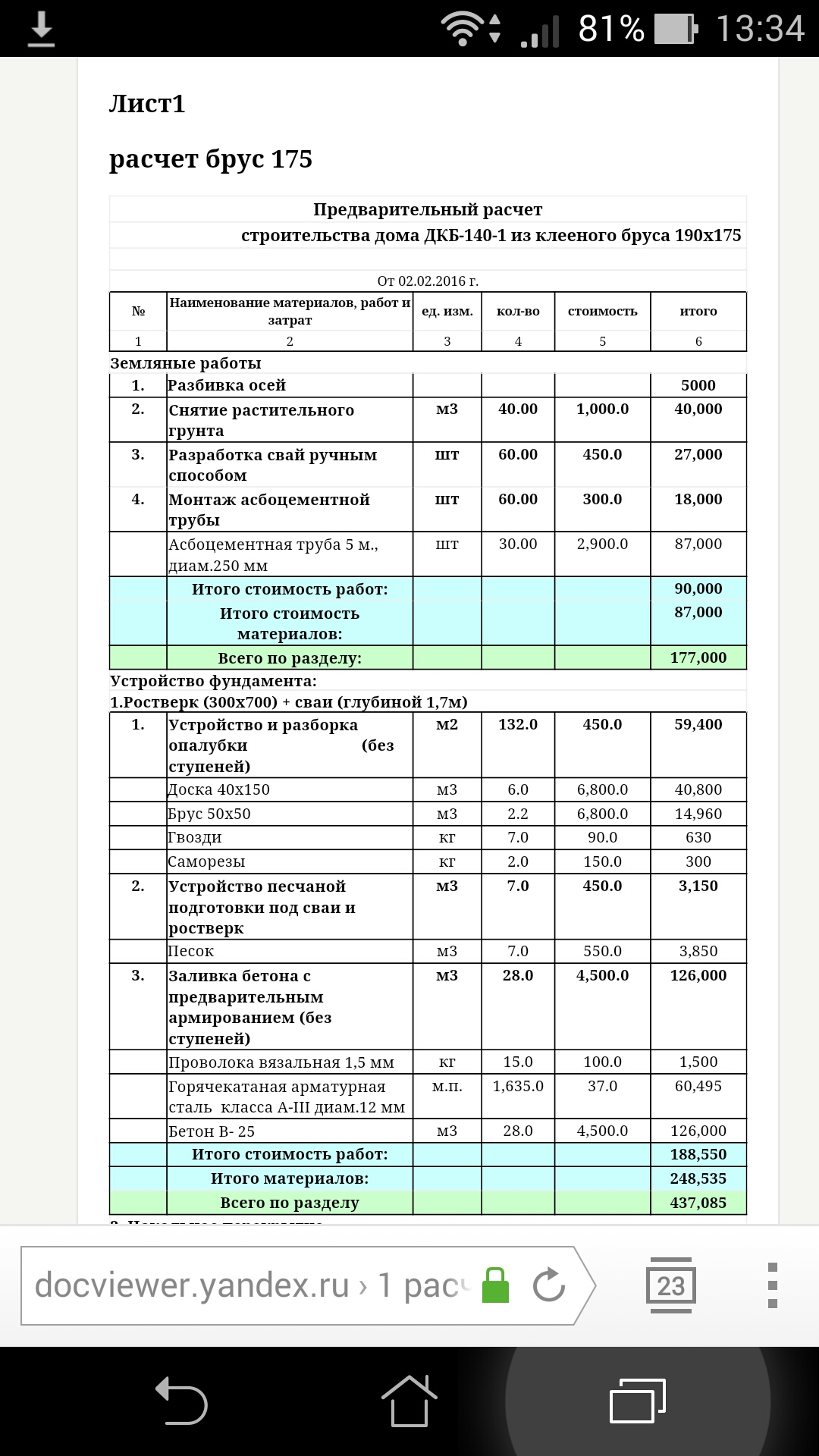 Из сметы получается, что 1 куб клеенки стоит 25.400 руб. Не слабо. Учитывая, что 190х170 не самый большой клееный брус, обычно побольше берут.