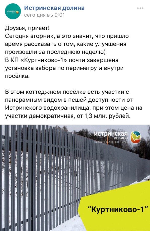 совсем видимо плохи дела у Вектора, делают 24% скидки от цены на сайте при 100% оплате (якобы новогодняя акция), так же акция 3 участка покупаешь-4й в подарок. продано чуть больше половины участков с июля 2017. со скидками желающих прибавилось) договор заключается так же с кооперативом Истринские дачи-2010 (наверное,так у всех). По договору получается, что именно Кооператив обязуется ввести нам все коммуникации. Срок сдачи поселка до конца 2020 года. Сейчас там поле, только стоят шашечки, помечающие границы участка и обозначения под будущие дороги. Вяло начали установку забора. Как люди уже участвующие в покупках недостроенных объектов, иллюзий не питаем, задерживают все и везде, даже крупные застройщики с хорошей репутацией. Здесь хоть собственность на руках, а не как в квартирах, отдашь 10 млн и несколько лет наблюдаешь за железобетонным остовом :help: С такой скидкой даже и не критично. Дом ставить пока не собираемся. Обещают временный проезд к участкам сделать весной. Но сами понимаете...